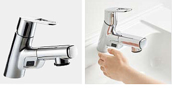 タッチレス水栓を選べば、水栓に触れることなく水が出せるため衛生的で、洗顔中や手洗い中で手が泡だらけの時や、子供が泥だらけの時でも安心です。ウルトラファインバブルシングルレバー水栓は、水流1ml当たり約2,200万個のウルトラファインバブルを含んだサイクロンミストシャワー水形がきれいに汚れを洗い流します。