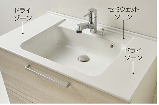 『ラクトワ』のコンパクトながらも広々とした人工大理石スクエアボールは、洗顔や手洗い時の水ハネを気にすることなく、ゆったりと使うことができます。両サイドのウェットゾーン/セミドライゾーンには、濡らしたくないメイク用品やタオル、ハンドソープなどを一時置きできるため、朝の忙しい時間でも洗面台が散らからず、効率よく身支度を整えられます。