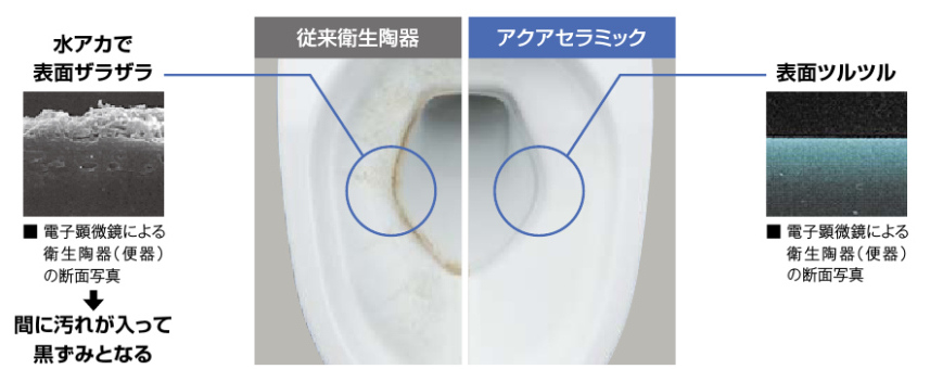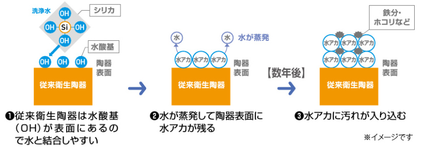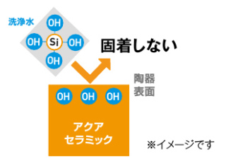衛生陶器表面に水酸基が出ない構造とすることで、水アカの固着を科学的に防ぎ、日頃のお手入れで水アカを落としいつでもキレイを保てます