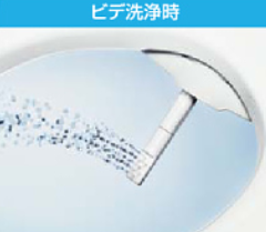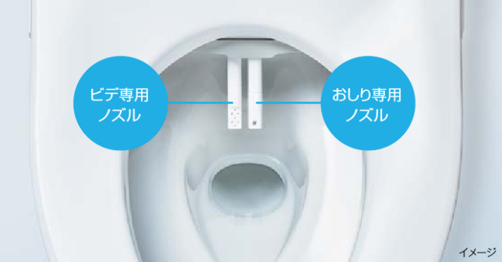 おしり洗浄とビデ洗浄は、専用ノズルがそれぞれ1本ずつ。おしり洗浄時にビデノズルは隠れているため、便のはね返り汚れも気にせず安心。
