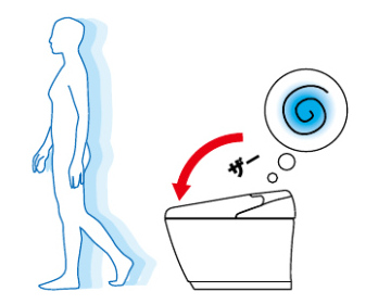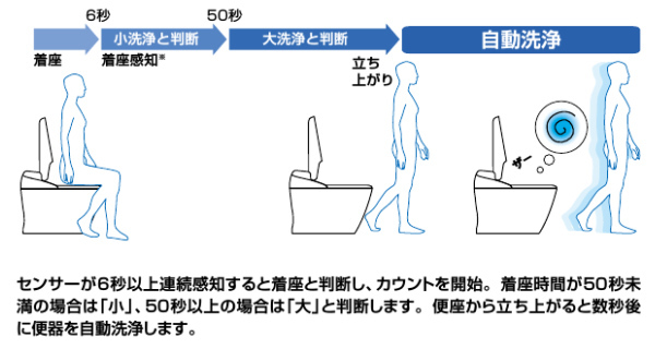 着座時間に応じて大・小切替。便座から立ち上がると自動で便フタが閉まり、洗浄するので流し忘れの心配もありません。
