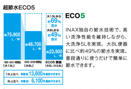 Jフィットの洗浄水量は、大洗浄5L、小洗浄3.8Lの超節水ECO5便器です。