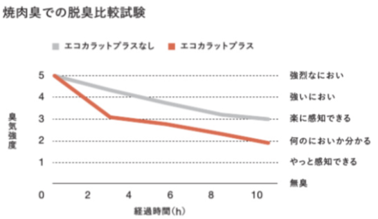 エコカラットプラスを施工した部屋と施工していない部屋で焼肉臭の脱臭比較試験を実施。エコカラットを施工した部屋では翌日には、気にならないレベルまでにおいが低減しました。においのあと片付けはお任せください♪
