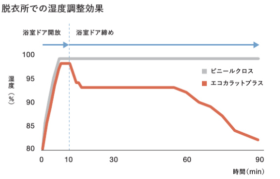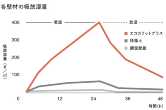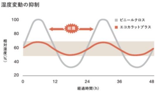 湿度が高い時は湿気を吸収し、乾燥している時は湿気を放出。エコカラットプラスはすぐれた調湿機能で快適な湿度に保とうとします。