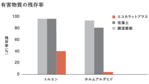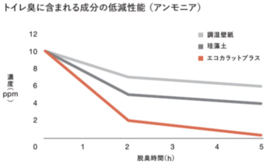 においが気になることも多いトイレ空間。その主な原因はアンモニア臭です。エコカラットプラスは超微細な孔でにおいの原因物質であるアンモニアを吸着、悪臭をやわらげます。その低減効果は珪藻土や調湿壁紙と比べても、はるかに優秀です。