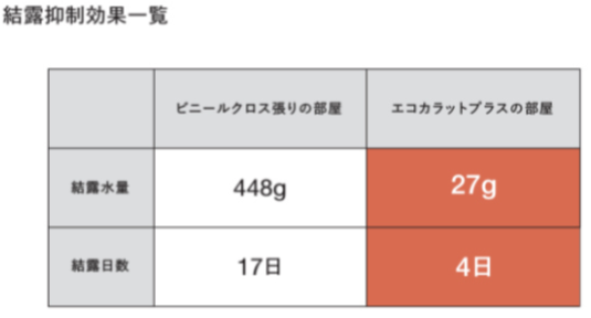 エコカラットプラスを施工した部屋と、ビニールクロス張りの部屋で窓面の結露水量を比較すると、エコカラットプラスの部屋の結露水量はビニールクロスのわずか1/15以下でした。さらに結露発生日数においても大きな差が見られました。