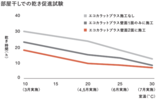 その効果は珪藻土の約6倍、調湿壁紙の25倍以上もあるんです!春夏秋冬、変化しつづける環境の中で、エコカラットプラスがちょうどいい湿度をつくります。