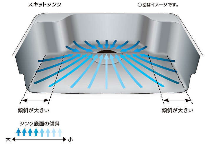 底面の傾きが左右の両端にいくほど大きくなる新形状。水が広がりにくく段差へ向かってスムーズに流れるため、シンク内のどこからでも効率よく排水できます。