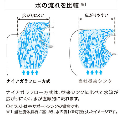 💡水流の広がりを抑えて、素早く段差に流し込むナイアガラフロー方式
