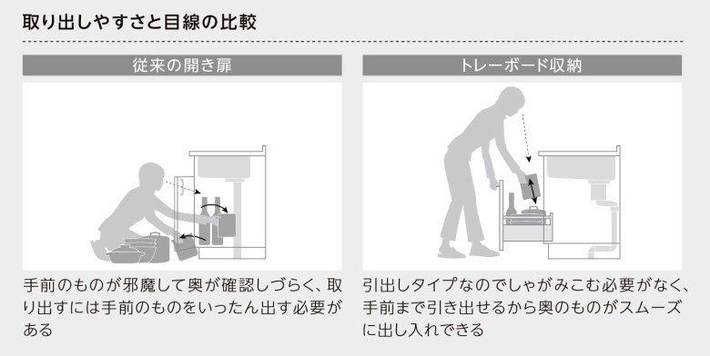 トレーボードの使いやすさを生かしながら、足元のけこみ部分も収納スペースとして無駄なく活用。限られたスペースを上手に活用したたっぷりしまえるストッカーです。
