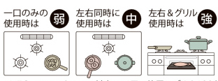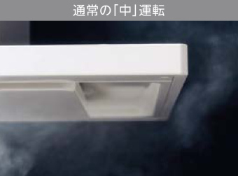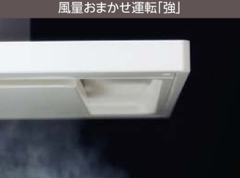 温度センサーが高温調理を検知した場合には「強運転」、それ以外の場合には「中/弱運転」を自動で選択して風量を調整。油煙の広がりをしっかり抑えて、省エネ運転も実現します!