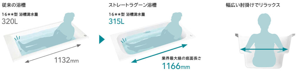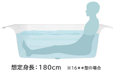 通常浴槽だと足を伸ばしきれない方でもリラックスできる浴槽サイズを目指して構造や形状を見直しました。従来の浴槽よりも底面長さを広げたため高身長の方でも、ゆったりつかることができます。
