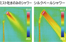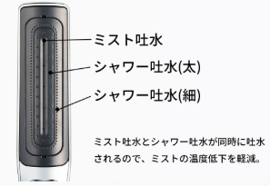 ミスト吐水をシャワー吐水が包み込むことでミスト吐水のみのシャワーに比べ温度が低下しにくい設計です。