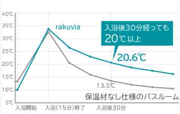 入浴後30分でも浴室は20℃以上。あたたまりやすく冷めにくいから快適環境を省エネでキープします。
