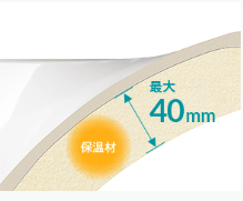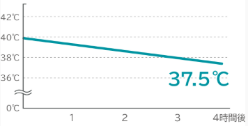 💡4時間後も温度低下をわずか2.5℃以内に抑えます。※ 温度変化データは、JISに準拠した評価方法に基づいたデータです。実使用状況により性能は異なります。配管内の凍結防止の為に、浴槽内のお湯を循環させる追い焚き給湯器をご使用の場合やジェットバスを付けた場合は浴槽の湯温がカタログ表示値より低下します。