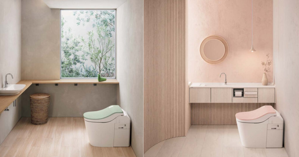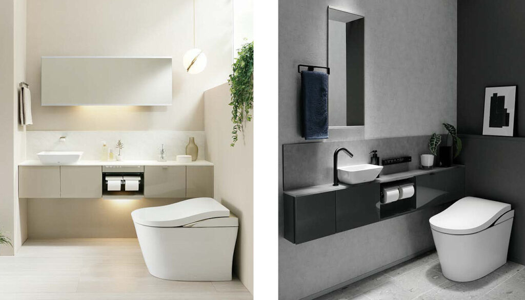 曲線を抑えたシャープなライン、壁付けタイプのタンクレス構造、ホワイトを基調としたミニマルデザインなど、住宅トレンドに合わせた統一感が強くなっています。