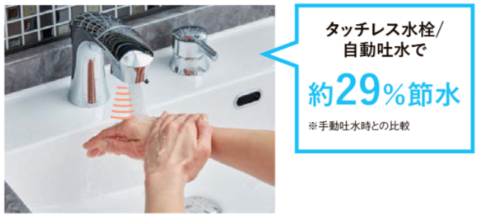 自動吐水や微細シャワーで水使用量を削減。