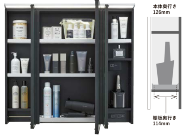 高品位なディテールの木製ミラーは、従来品より収納部の奥行きが広くなりました。ドライヤーや充電式のシェイバーなどの美容家電の収納にもおすすめです。