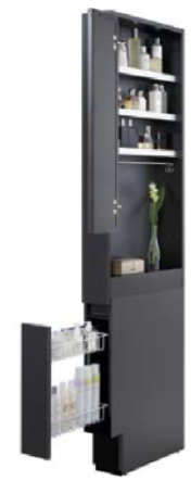 デッドスペースになりがちな洗面横の隙間を有効活用。上部のサイドミラー付収納には化粧品などを、下部の収納 には入浴剤や浴室用品などを収納できます。